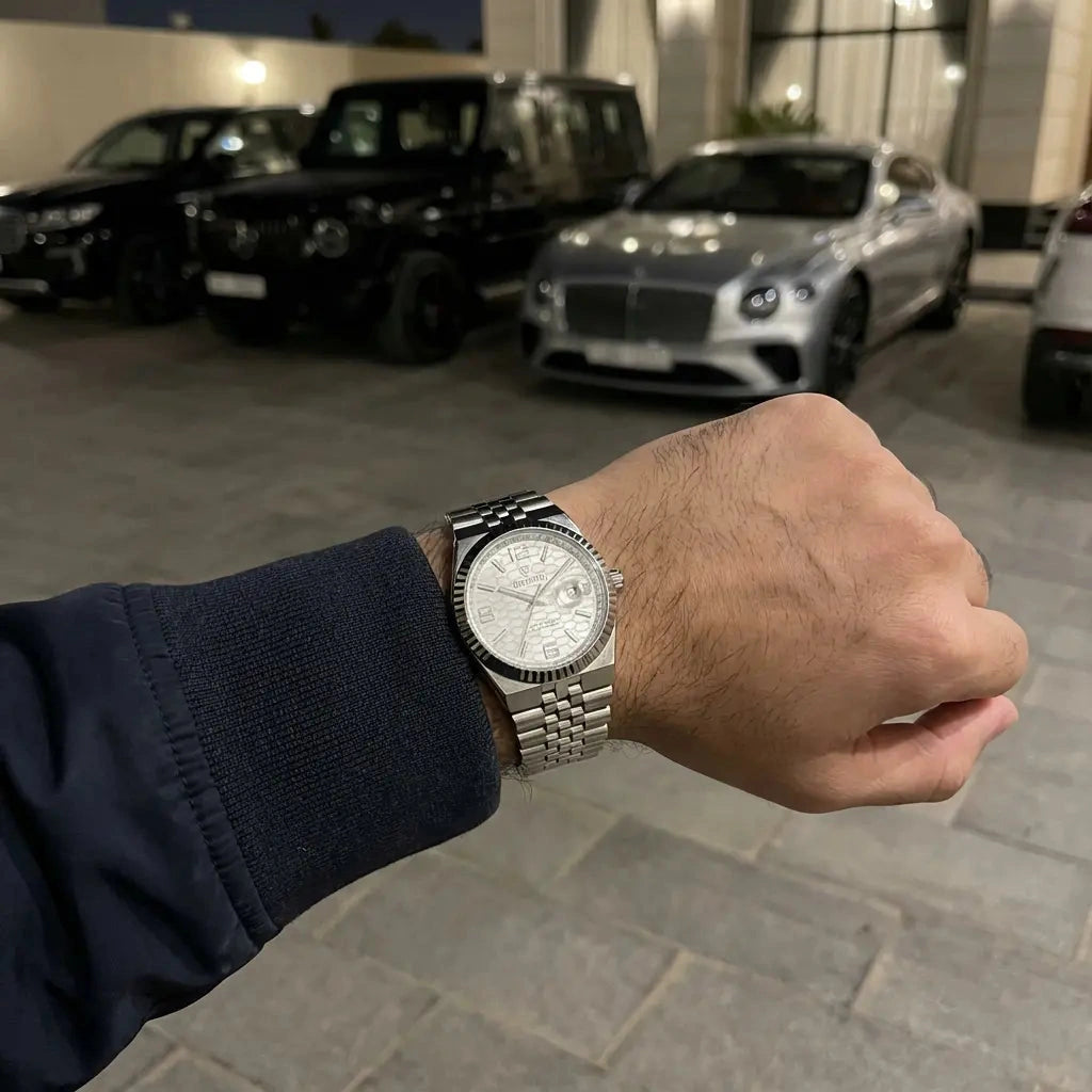هي لمسة فخامة تكمّل حضورك وتعكس ذوقك الرفيع. تصميم أنيق بتفاصيل دقيقة، وجودة تشعر بها من أول نظرة. الخيار المثالي للرجل اللي يبغى شكل فاخر بدون ما يدفع سعر مبالغ فيه،